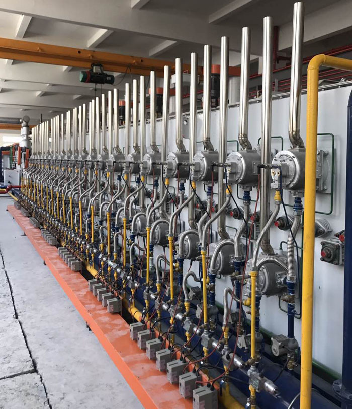 2.7爐內設有3道軟簾門(火焰簾),爐口再裝有活動爐門,可防止爐內保護氣氛的流失,減少甲醇的用量,降低生產成本,同時解決軟簾門檢修頻繁的問題。 2.8為保證爐膛內爐溫的均勻性,采用4區加熱4臺變壓器進行控制。 2.9為防止設備加熱元件受熱后的延伸性以及方便更換,在爐體兩側的加熱元件引出棒的連接導線均為耐高溫軟線連接。 2.10為了滿足客戶的產量要求,在淬火一區不發生較大的降溫的同時,加密淬火一區的輻射管數量,增大淬火一區的功率,在不影響產品工藝的前提下,達到增加產能節約電能的目的。 2.11淬火爐落料口處在砌爐過程中采用梯型式結構,以防止長期使用后產生積料,減少工件的損耗和堆積。 上一個:鐘罩式退火爐 |